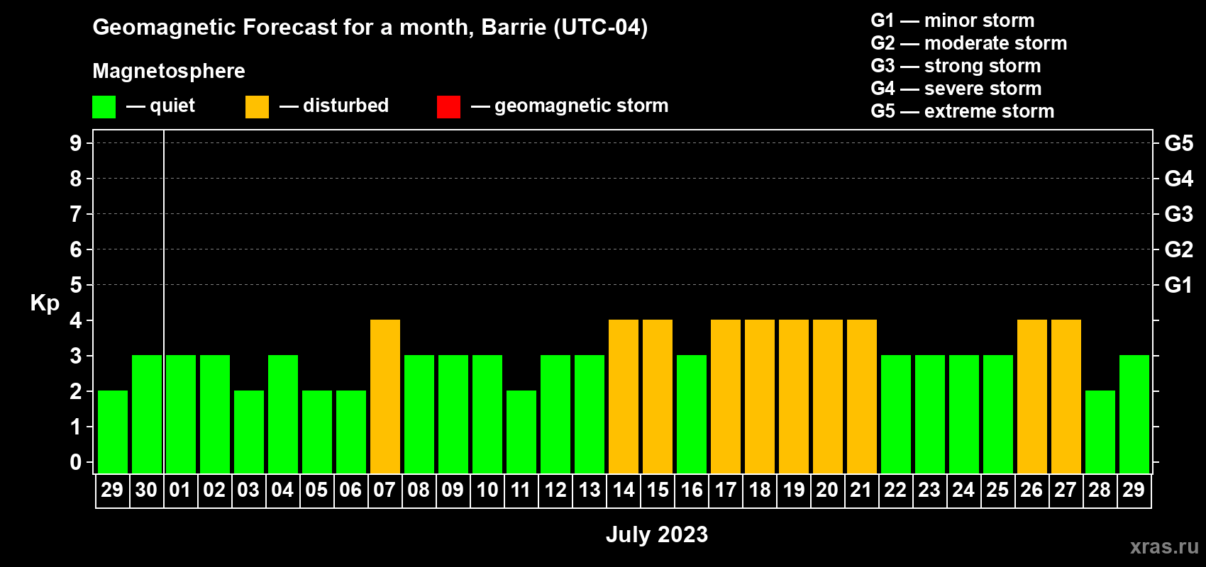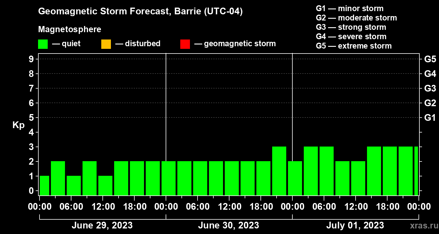 Geomagnetic activity forecast in Barrie — Jun 29, 2023