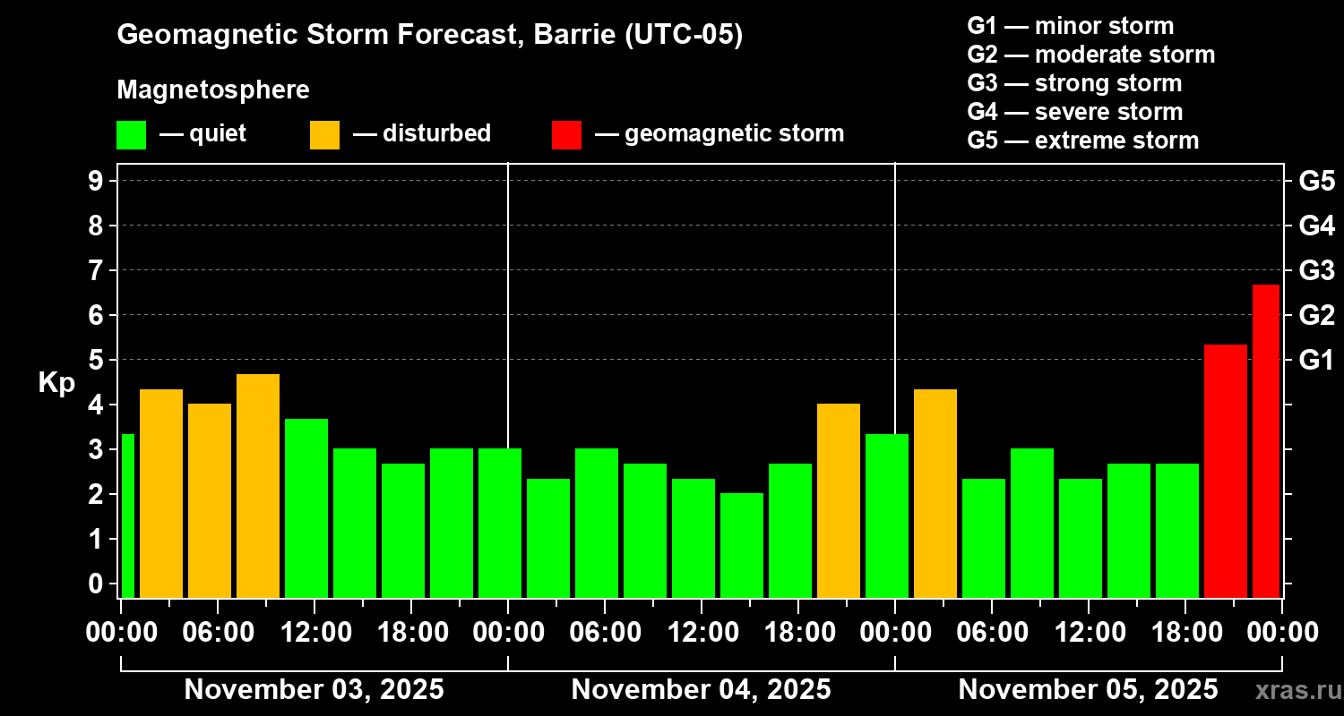 Geomagnetic storm forecast in Barrie for Nov 03, 2025