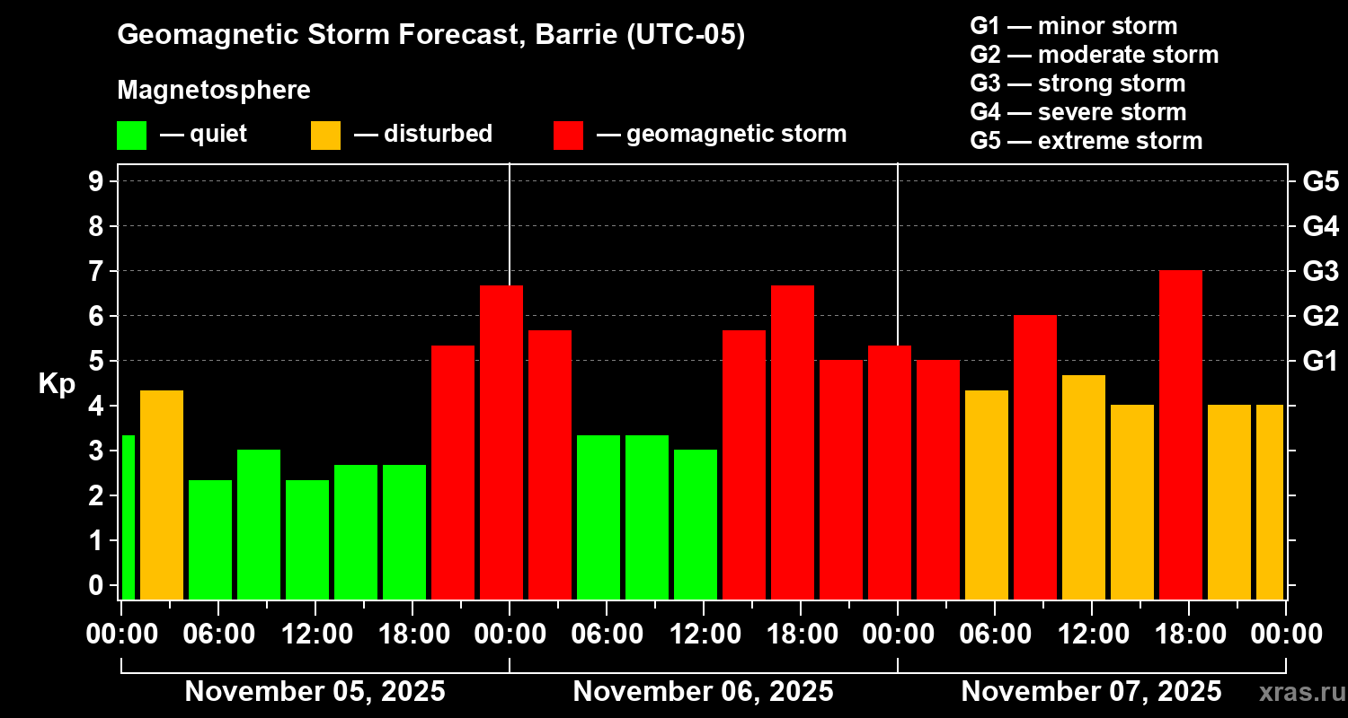 Geomagnetic storm forecast in Barrie for Nov 05, 2025