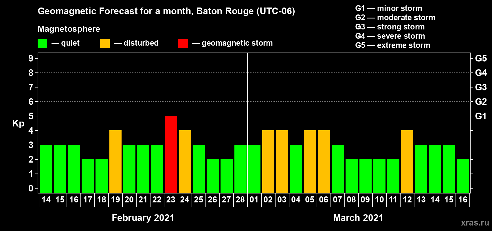 Geomagnetic storm forecast in Baton Rouge for Feb 14, 2021