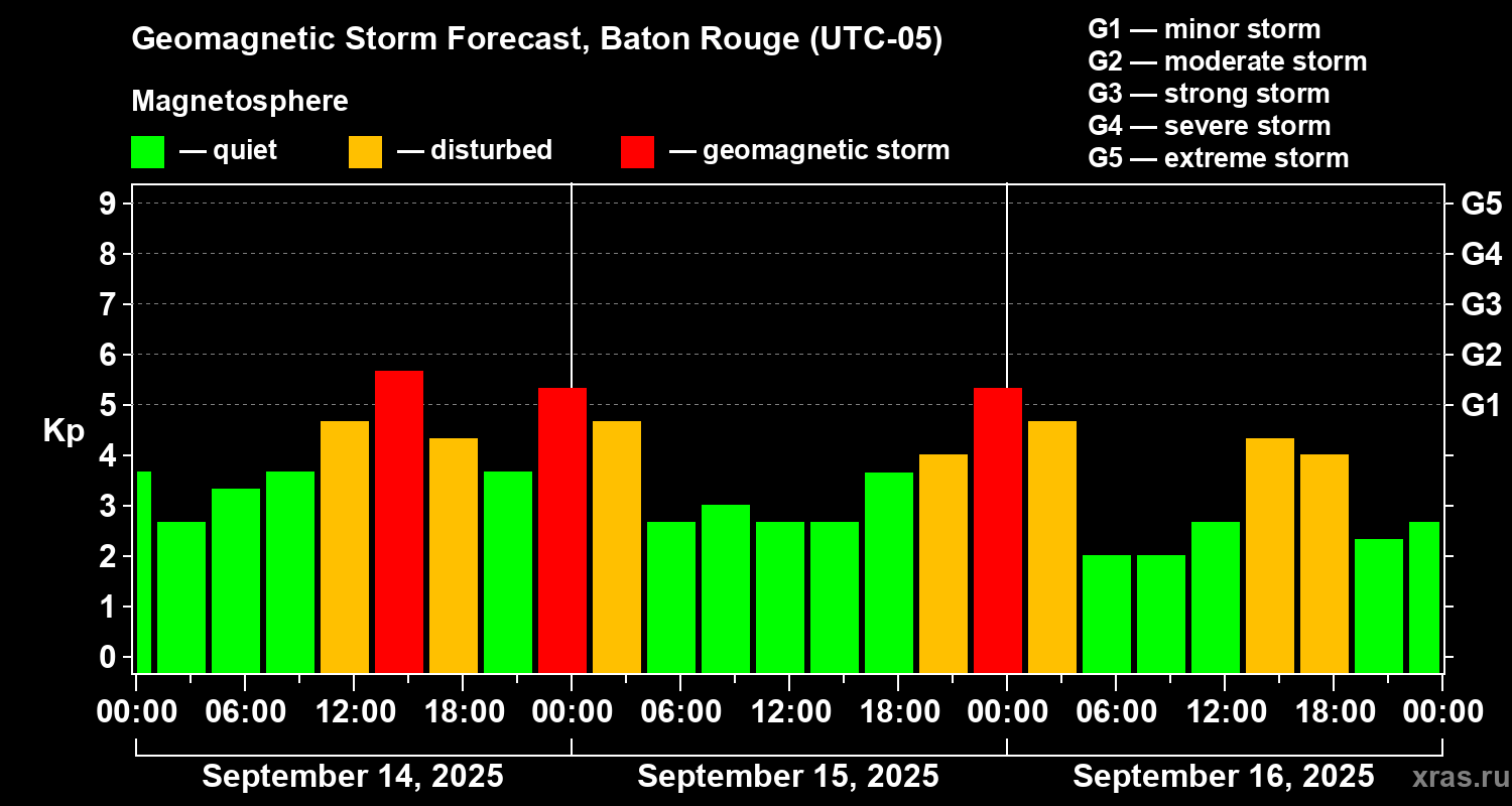 Geomagnetic storm forecast in Baton Rouge for Sep 14, 2025