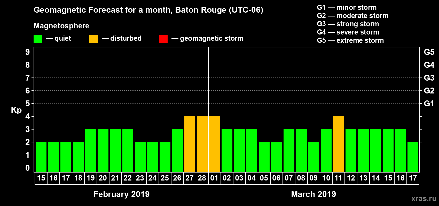 Geomagnetic storm forecast in Baton Rouge for Feb 15, 2019