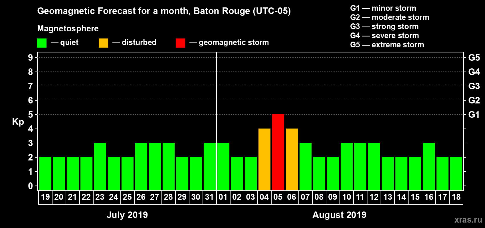 Geomagnetic storm forecast in Baton Rouge for Jul 19, 2019