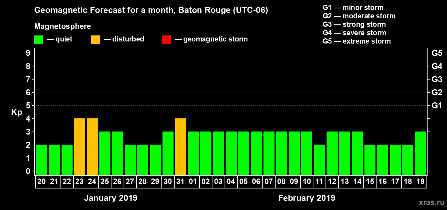 Geomagnetic storm forecast in Baton Rouge for Jan 20, 2019