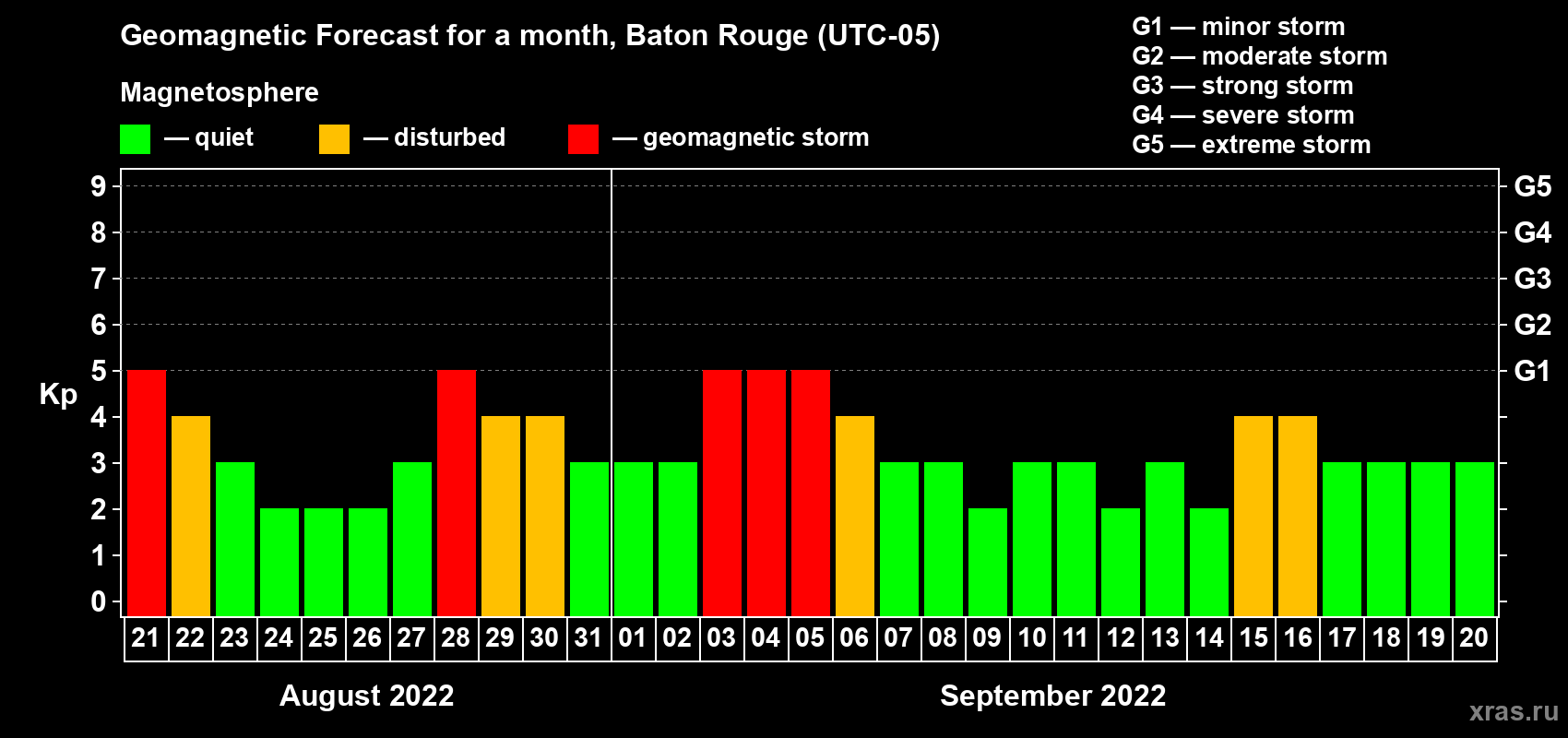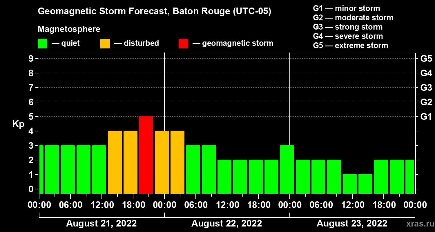 Geomagnetic storm forecast in Baton Rouge for Aug 21, 2022