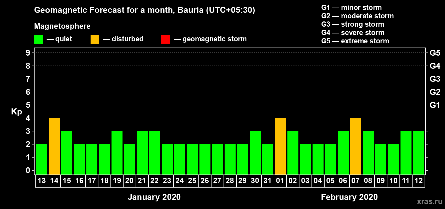 Geomagnetic storm forecast in Bauria for Jan 13, 2020