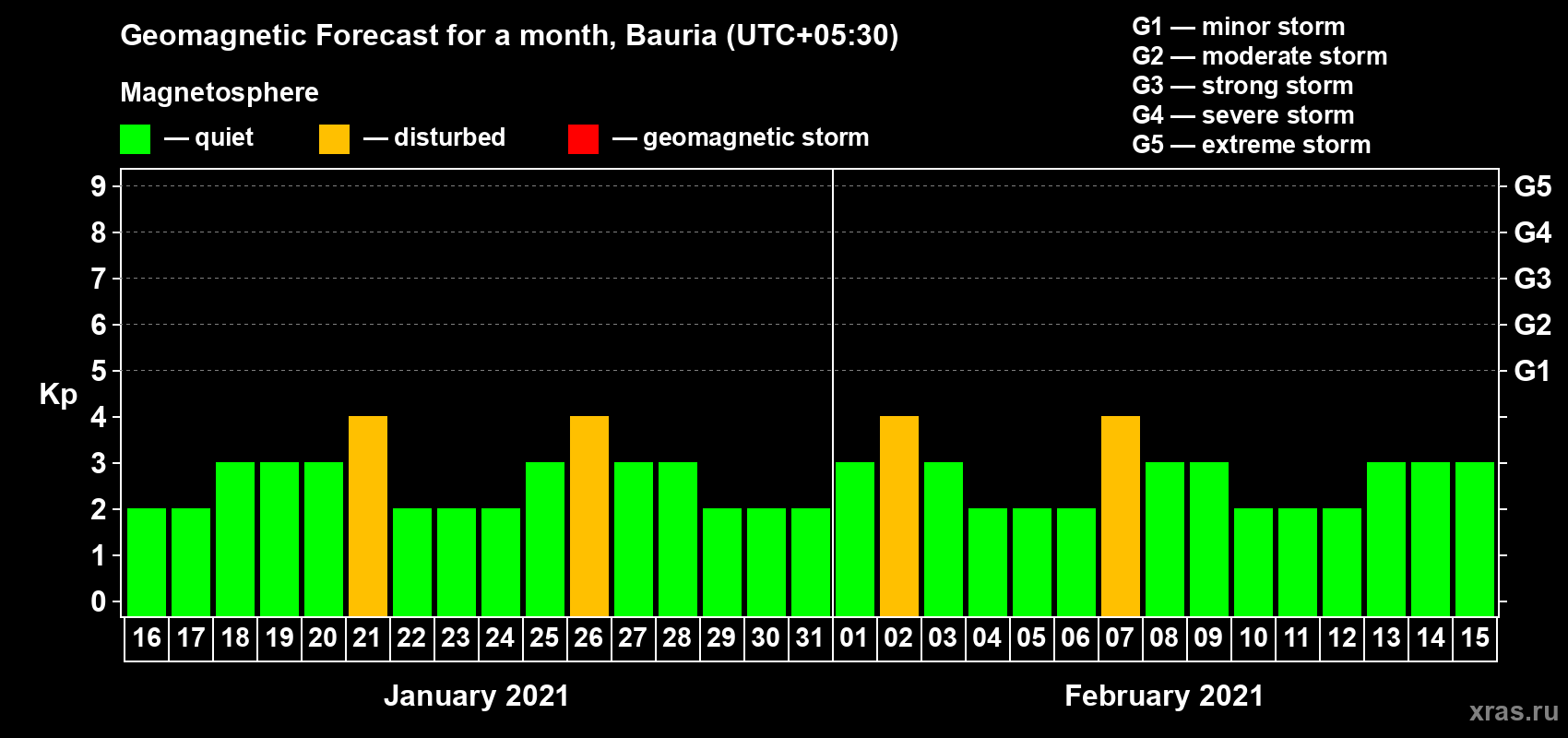 Geomagnetic storm forecast in Bauria for Jan 16, 2021