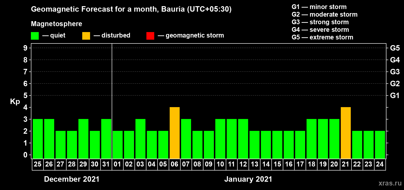 Geomagnetic storm forecast in Bauria for Dec 25, 2020