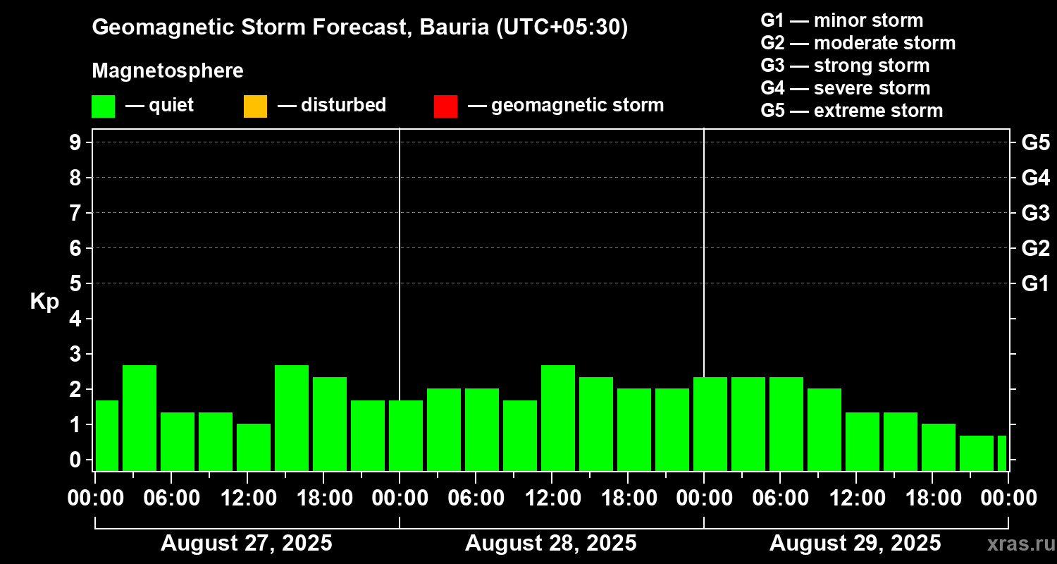 Geomagnetic storm forecast in Bauria for Aug 27, 2025