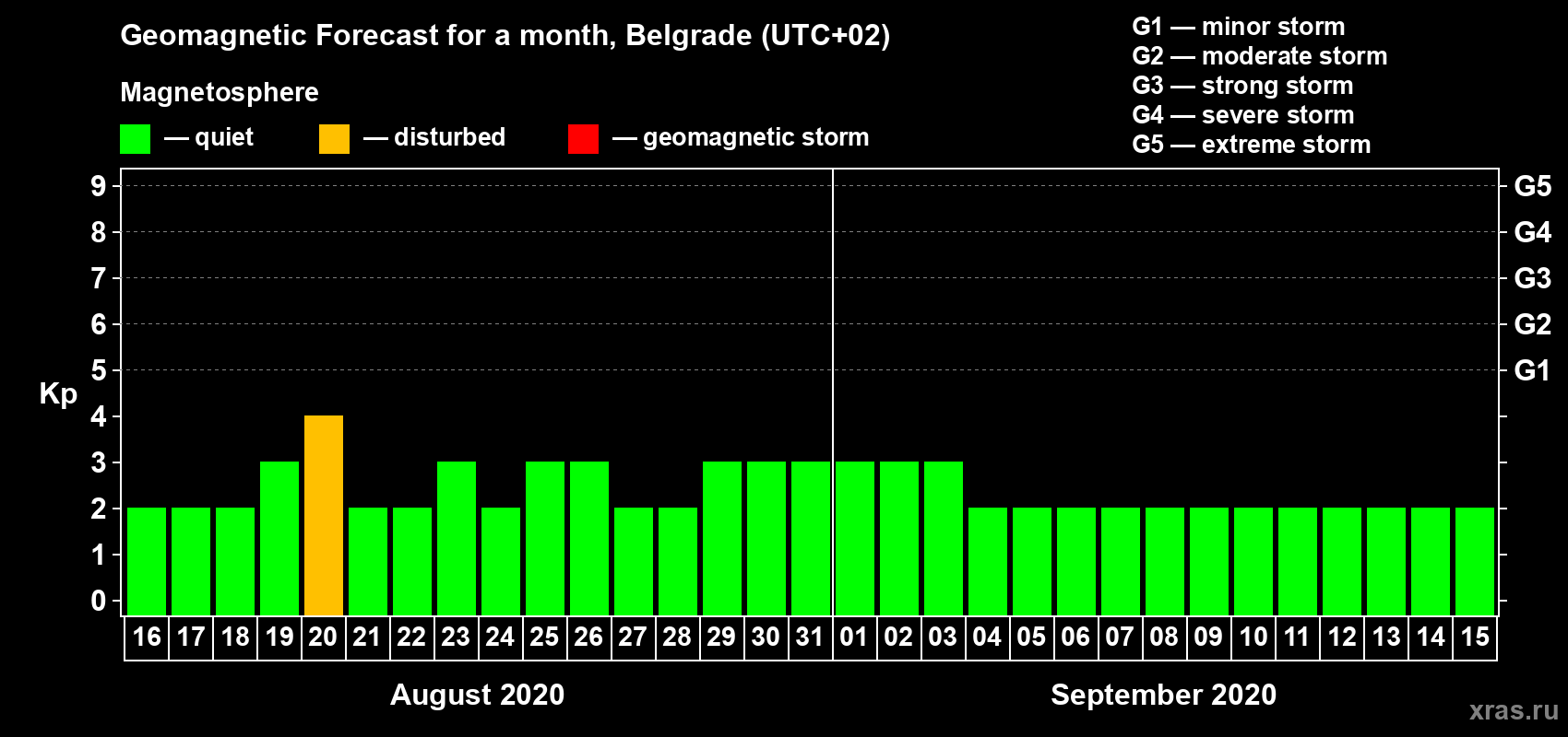 Geomagnetic storm forecast in Belgrade for Aug 16, 2020
