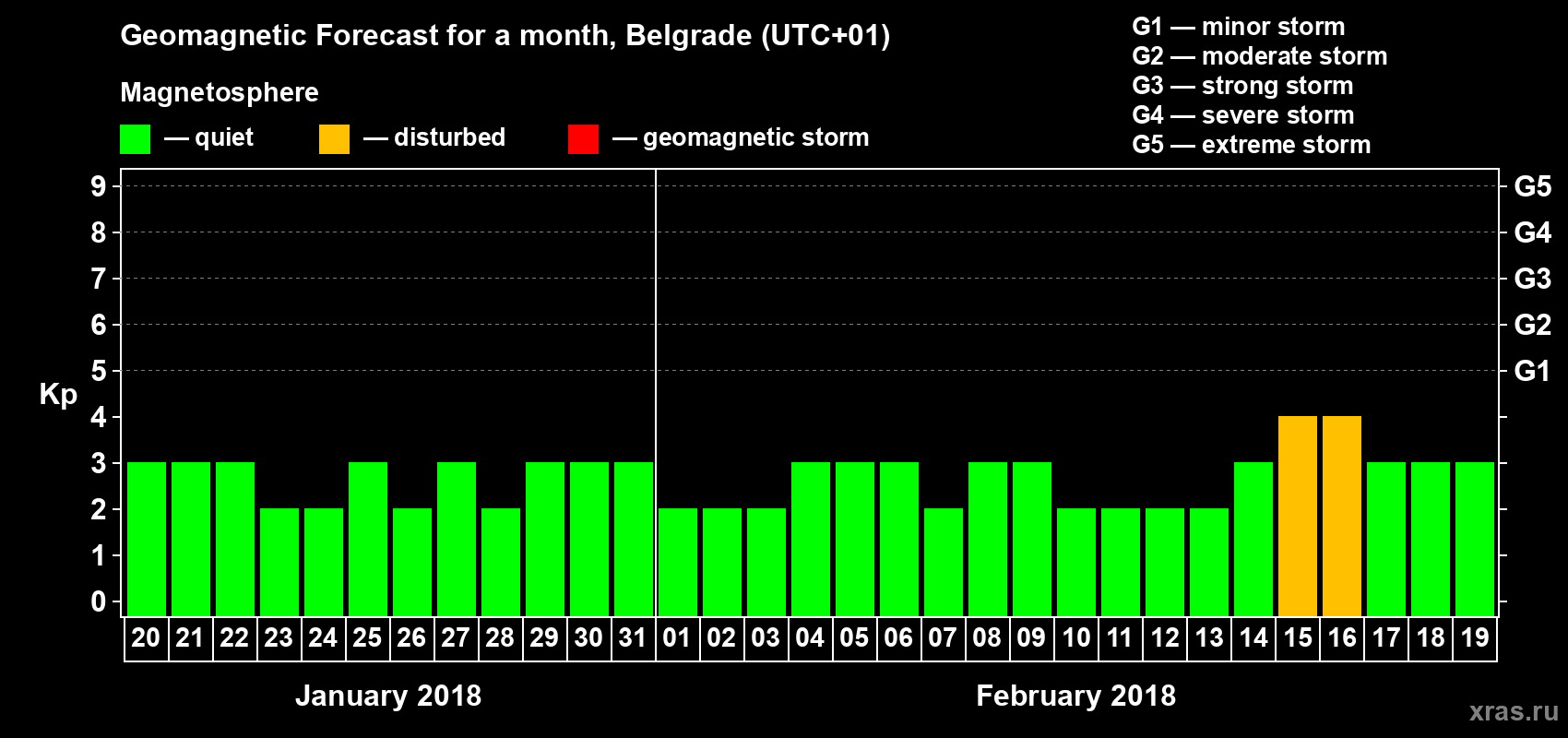 Geomagnetic storm forecast in Belgrade for Jan 20, 2018