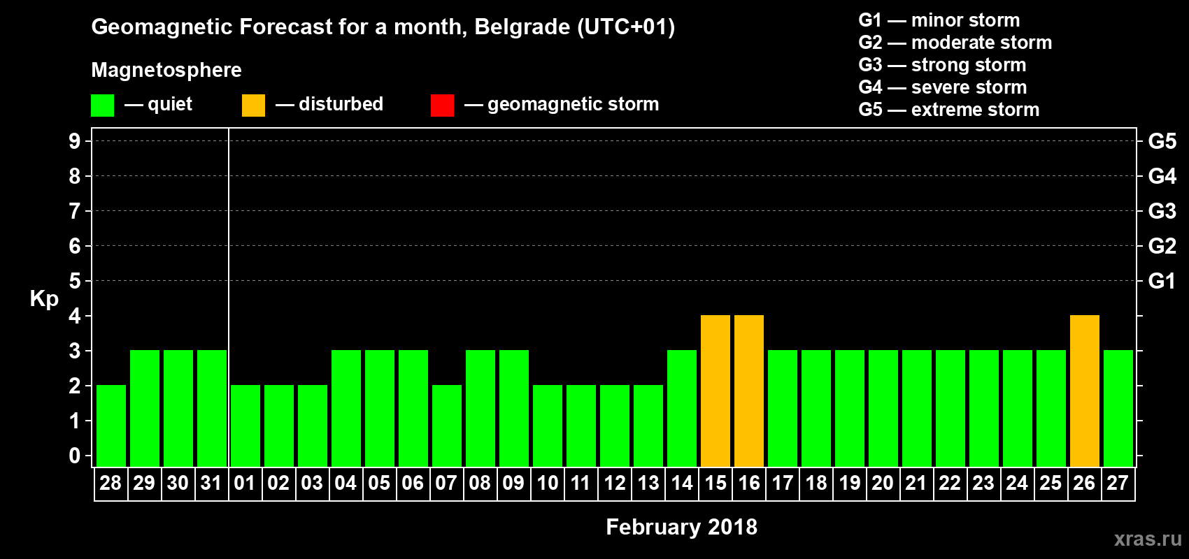 Geomagnetic storm forecast in Belgrade for Jan 28, 2018