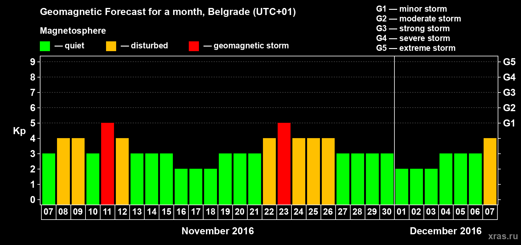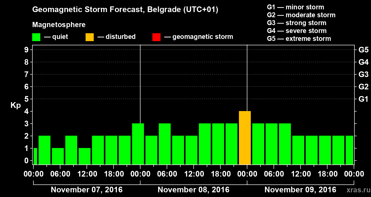 Geomagnetic storm forecast in Belgrade for Nov 07, 2016