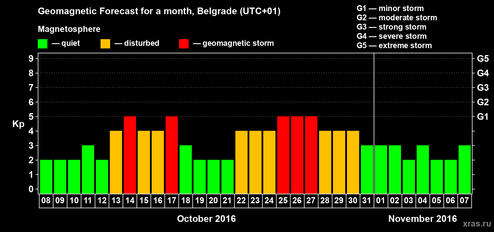 Geomagnetic storm forecast in Belgrade for Oct 08, 2016