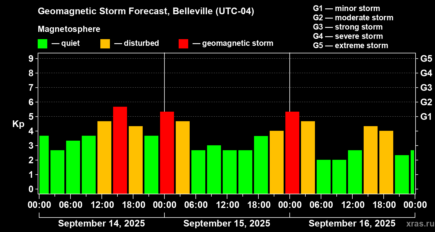 Geomagnetic storm forecast in Belleville for Sep 14, 2025