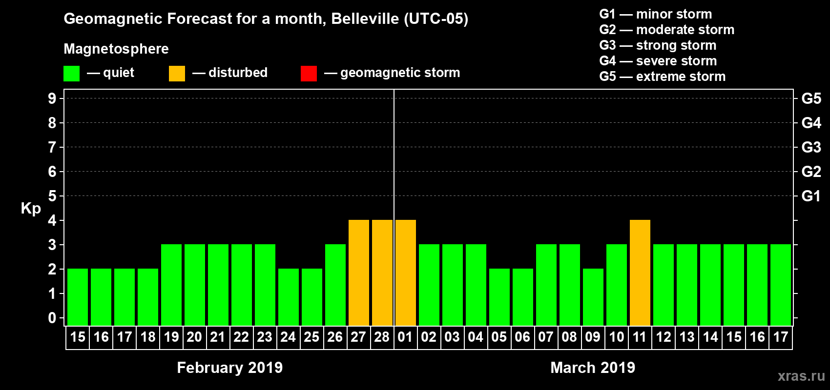Geomagnetic storm forecast in Belleville for Feb 15, 2019