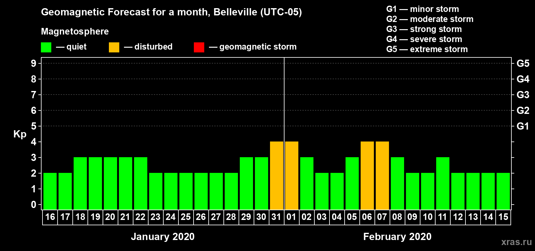 Geomagnetic storm forecast in Belleville for Jan 16, 2020