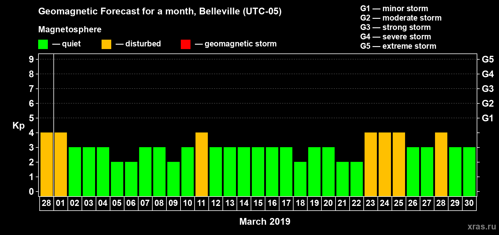 Geomagnetic storm forecast in Belleville for Feb 28, 2019