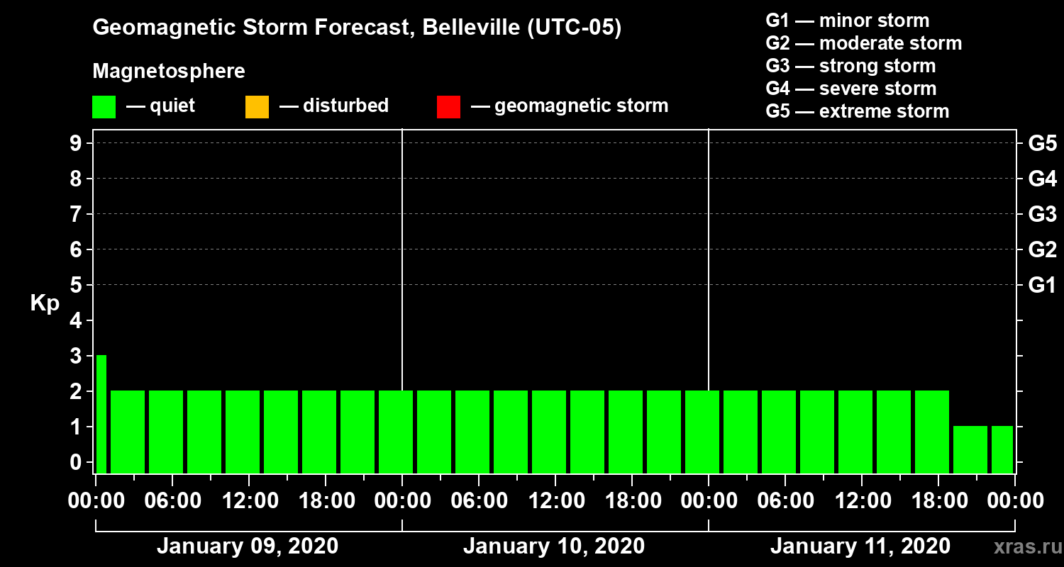 Geomagnetic storm forecast in Belleville for Jan 09, 2020