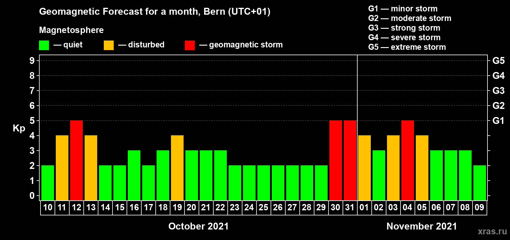 Geomagnetic storm forecast in Bern for Oct 10, 2021