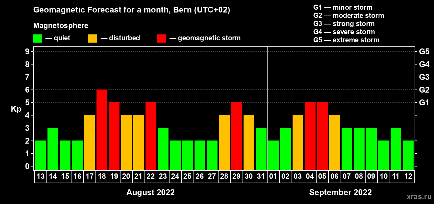 Geomagnetic storm forecast in Bern for Aug 13, 2022