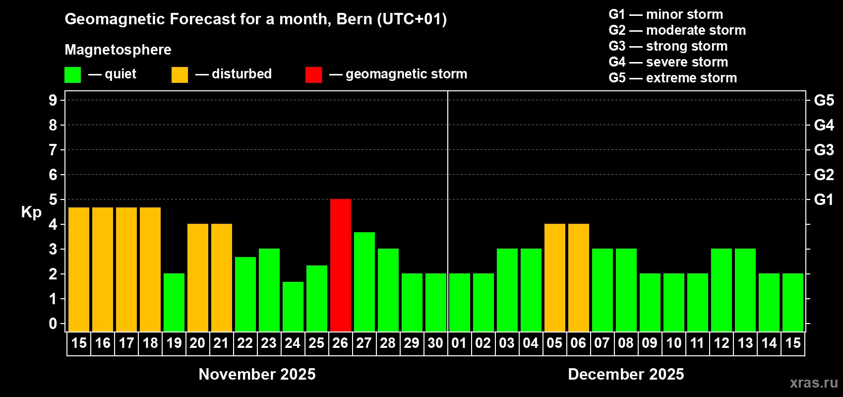 Geomagnetic storm forecast in Bern for Nov 15, 2025