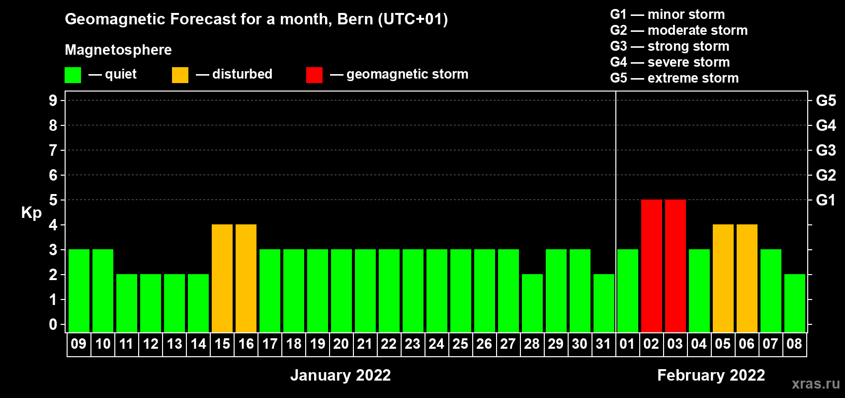 Geomagnetic storm forecast in Bern for Jan 09, 2022