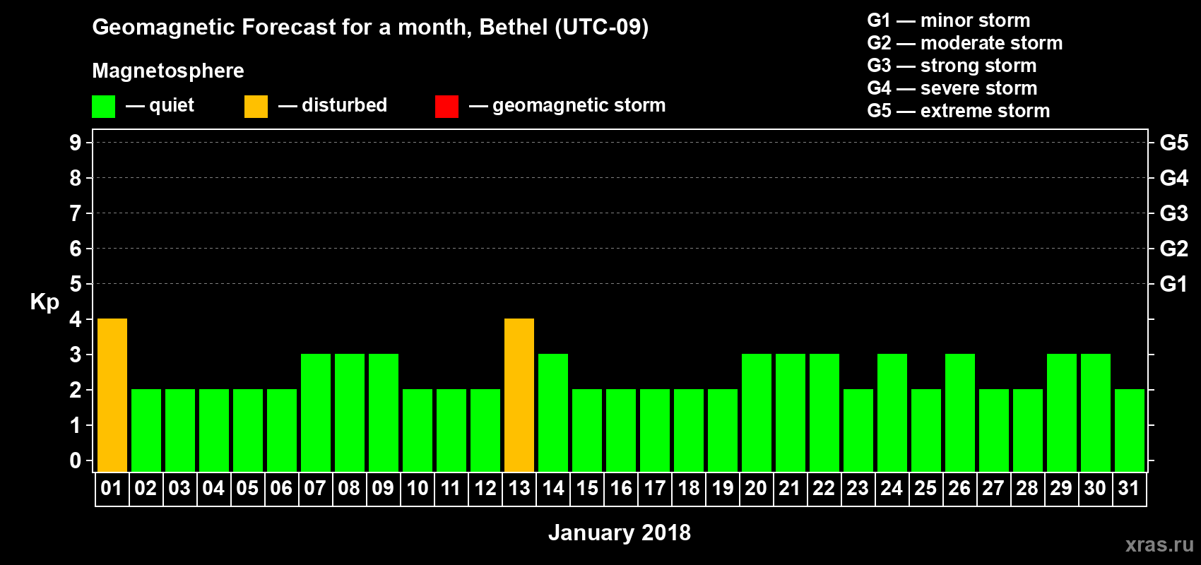 Geomagnetic storm forecast in Bethel for Jan 01, 2018