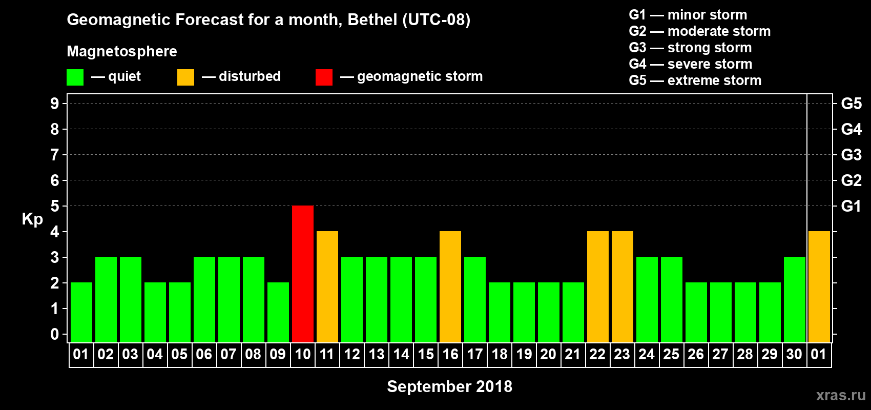 Geomagnetic storm forecast in Bethel for Sep 01, 2018