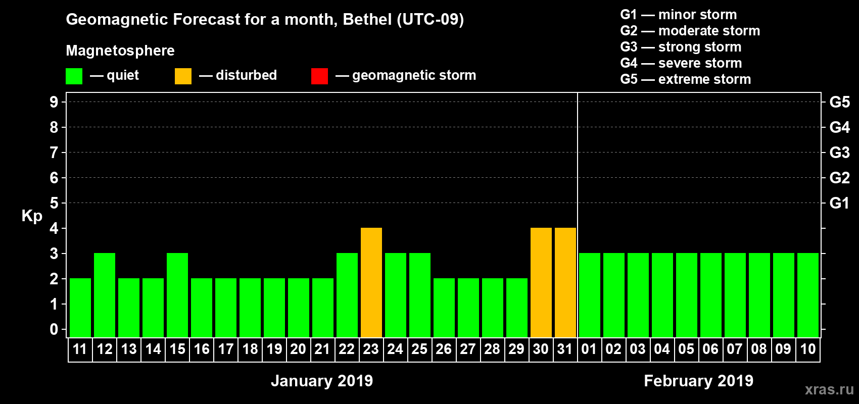 Geomagnetic storm forecast in Bethel for Jan 11, 2019