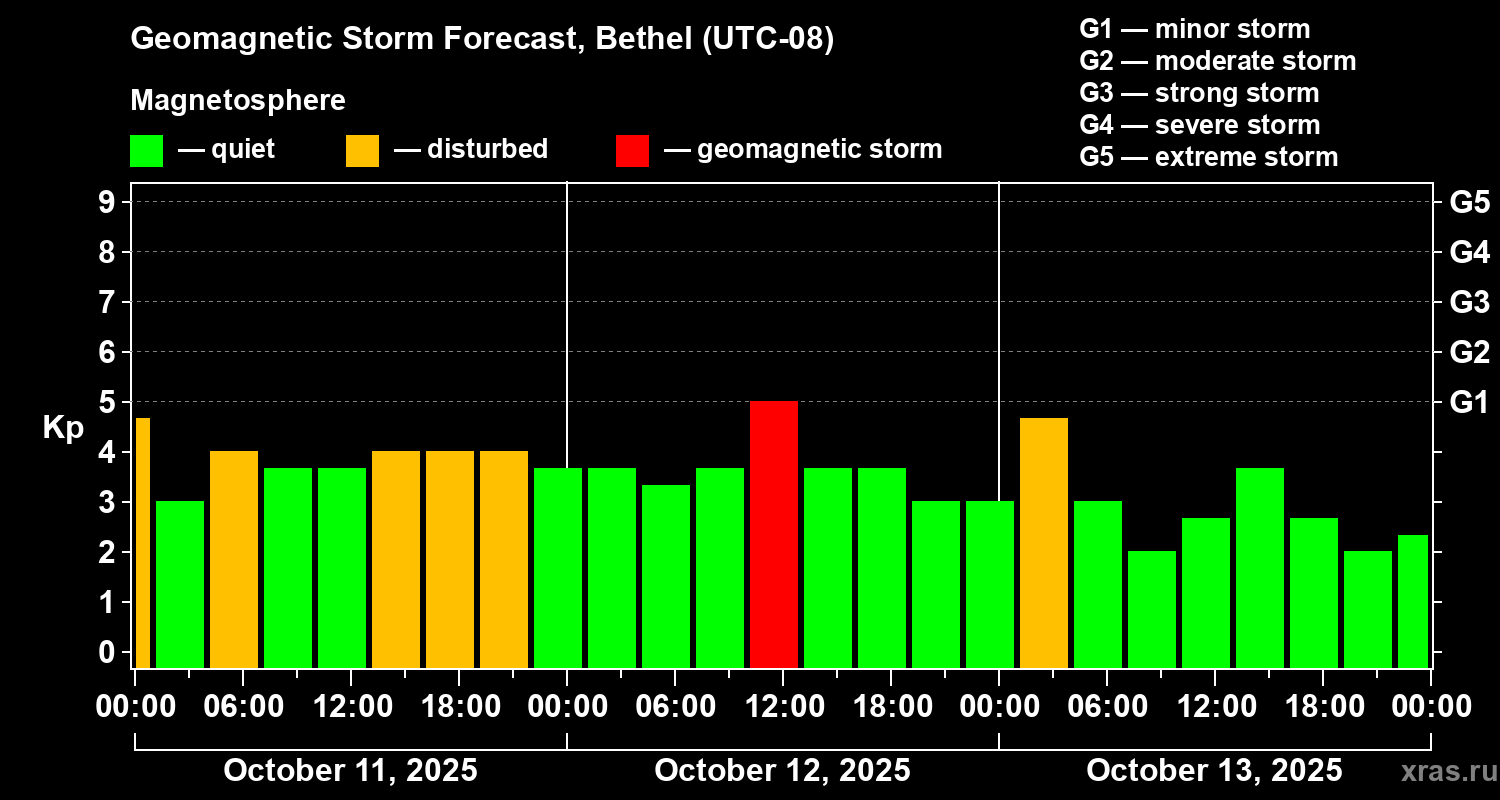 Geomagnetic storm forecast in Bethel for Oct 11, 2025