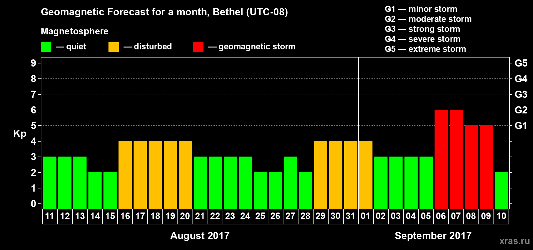 Geomagnetic storm forecast in Bethel for Aug 11, 2017