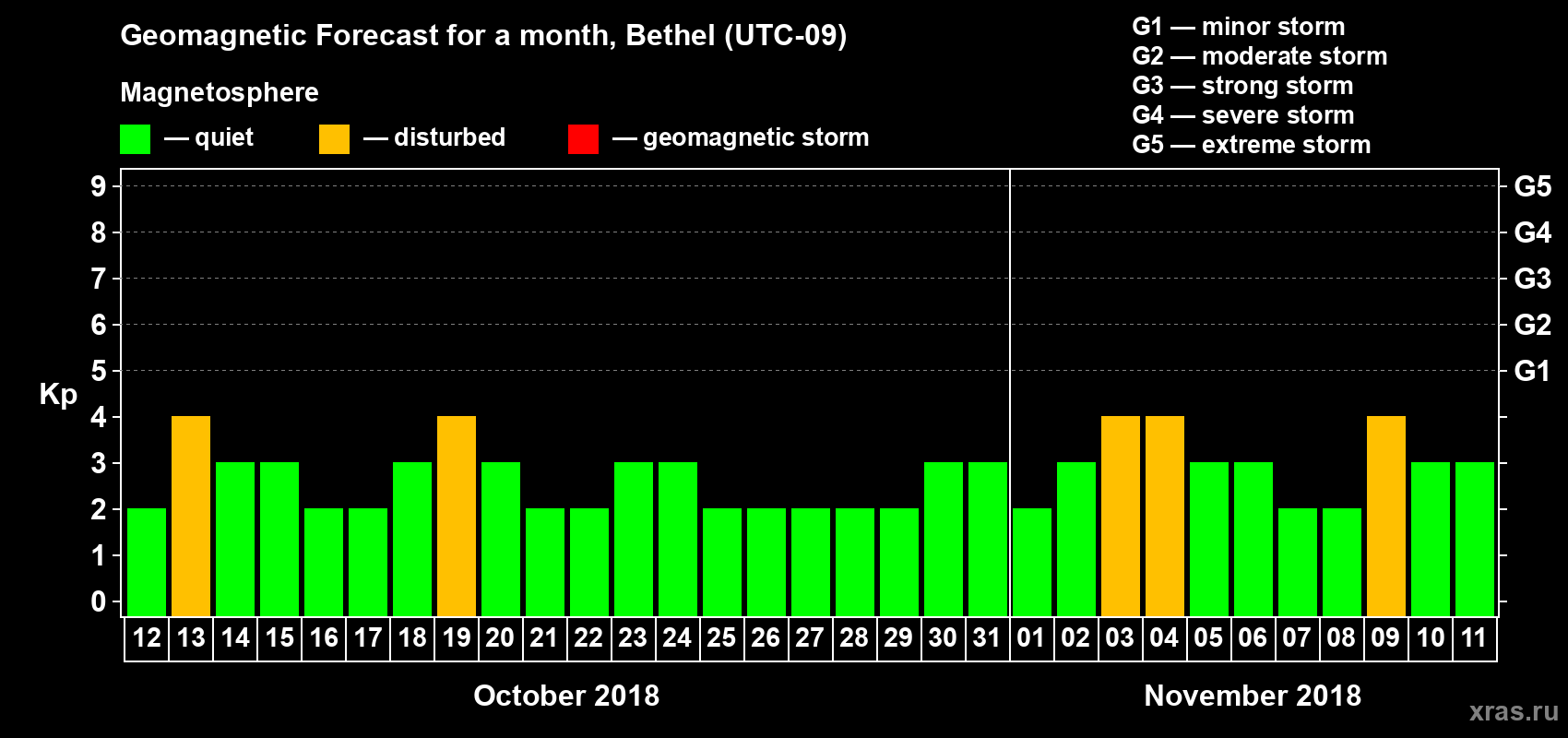 Geomagnetic storm forecast in Bethel for Oct 12, 2018