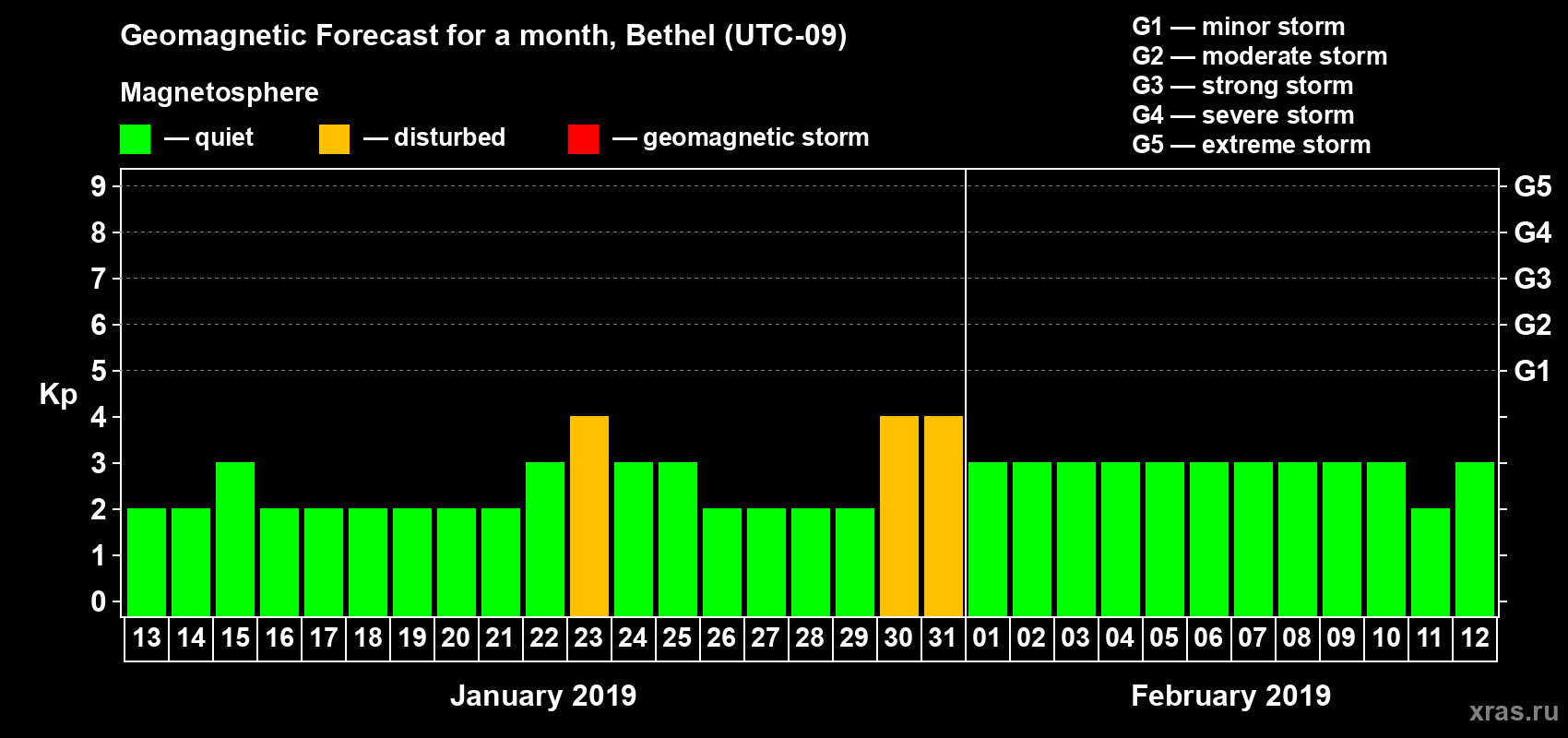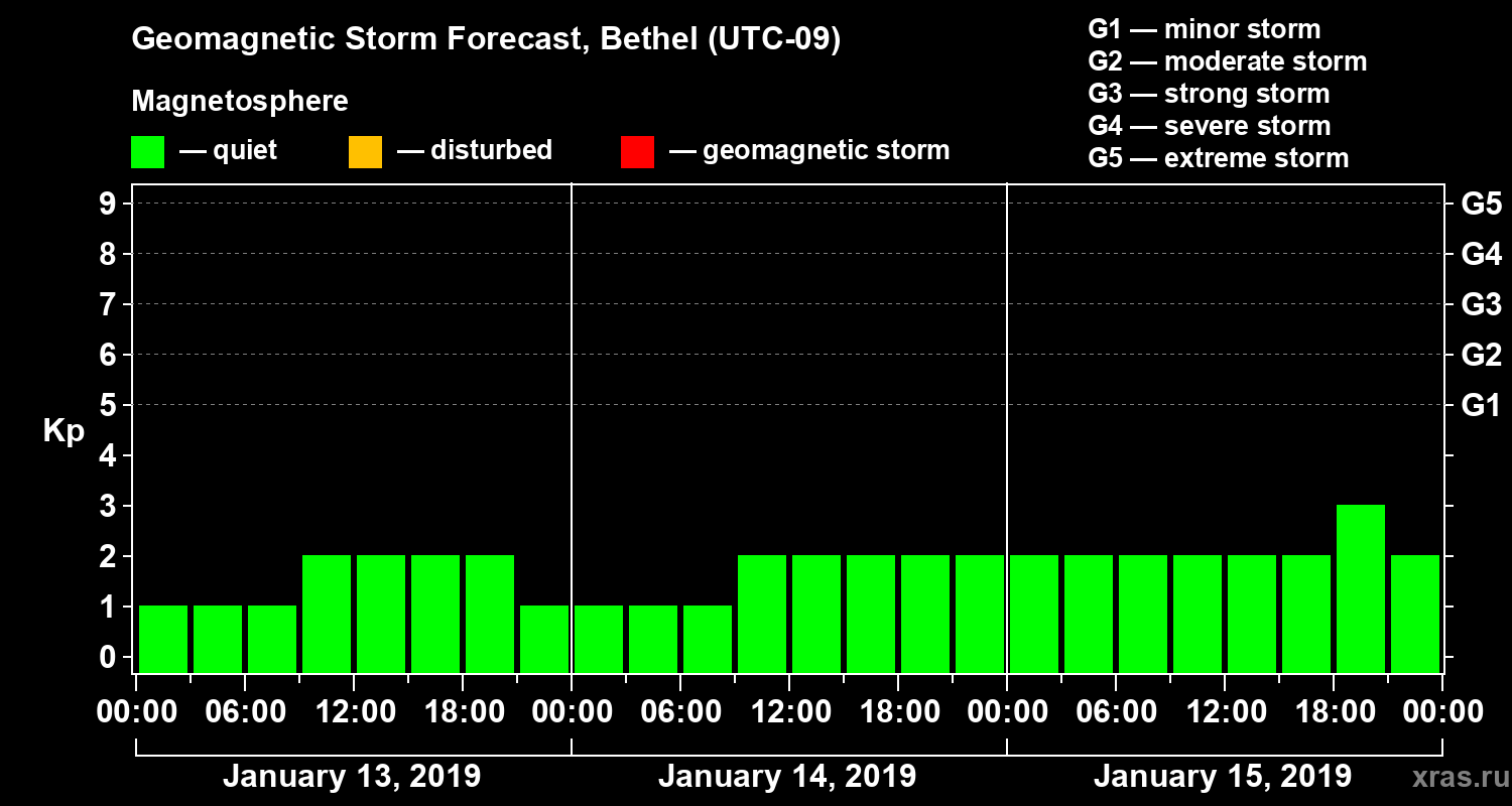 Geomagnetic storm forecast in Bethel for Jan 13, 2019