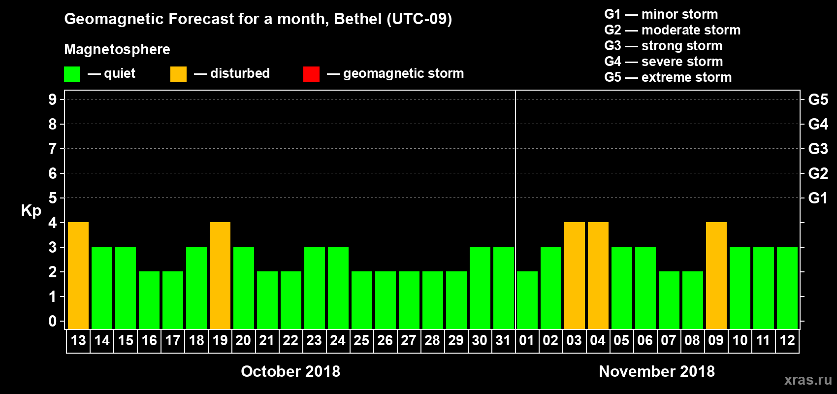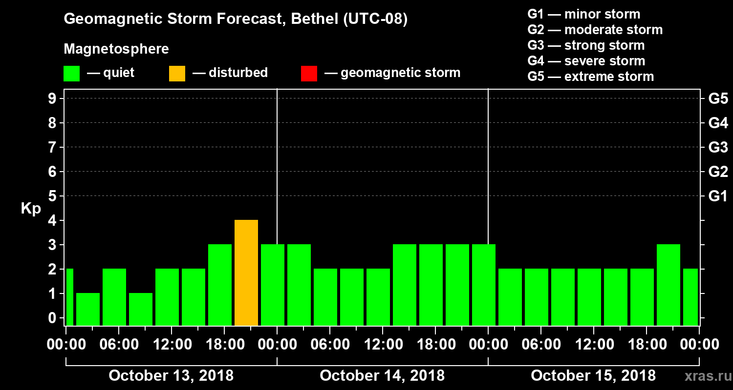 Geomagnetic storm forecast in Bethel for Oct 13, 2018