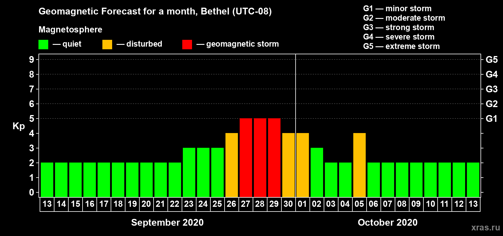 Geomagnetic storm forecast in Bethel for Sep 13, 2020