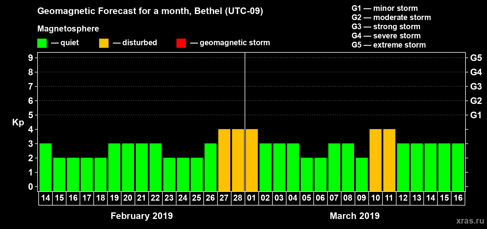 Geomagnetic storm forecast in Bethel for Feb 14, 2019
