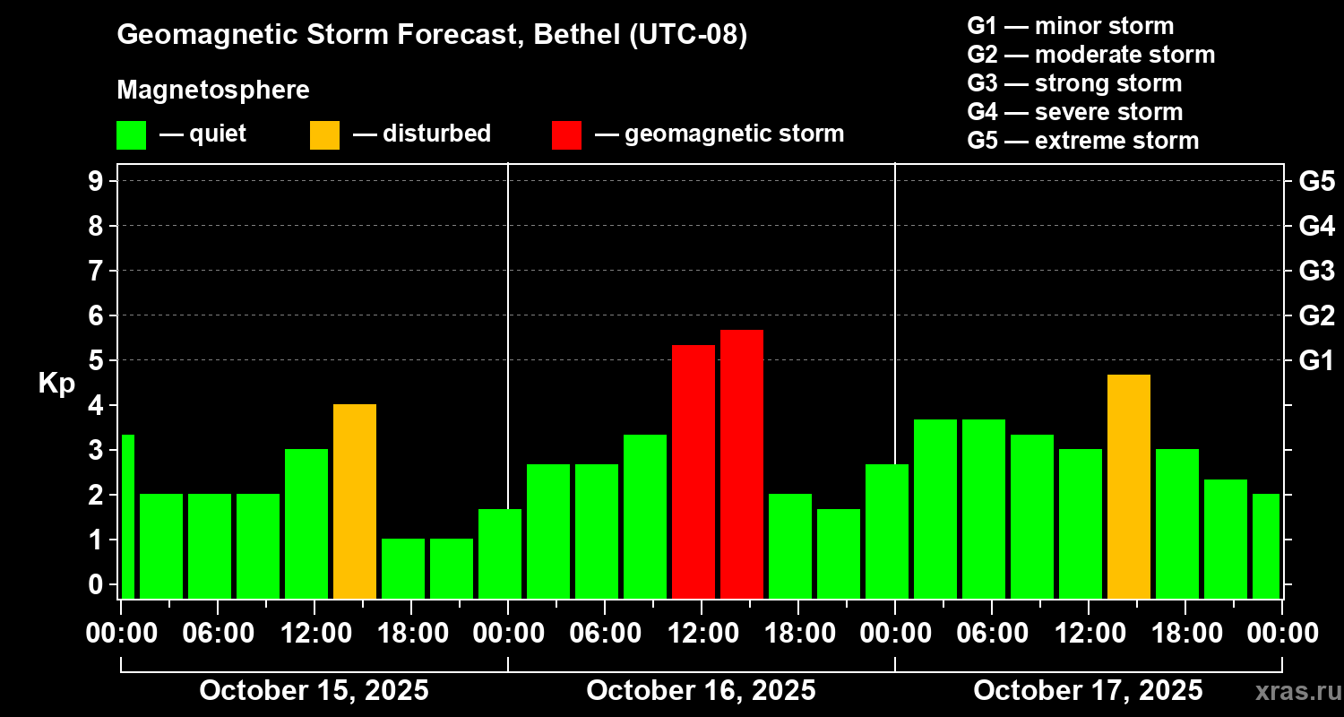 Geomagnetic storm forecast in Bethel for Oct 15, 2025