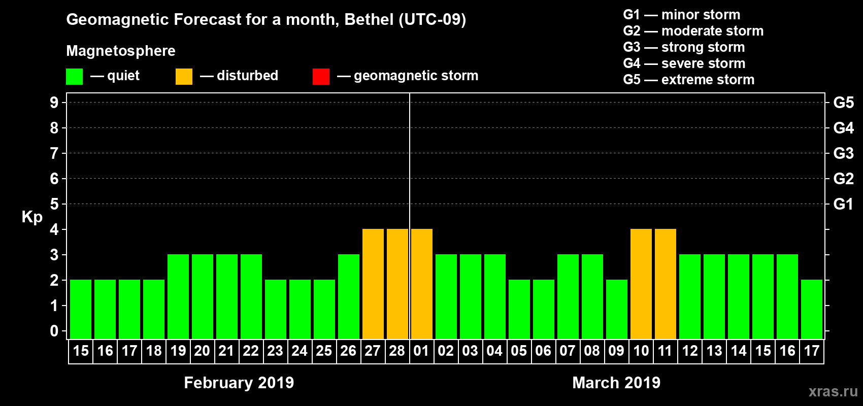 Geomagnetic storm forecast in Bethel for Feb 15, 2019