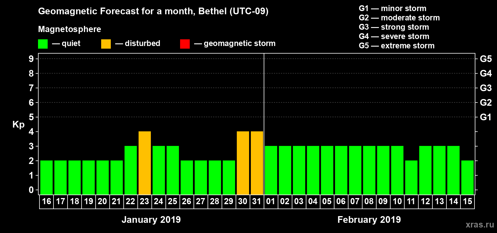 Geomagnetic storm forecast in Bethel for Jan 16, 2019