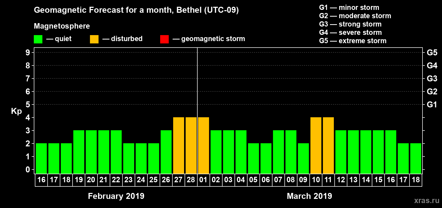 Geomagnetic storm forecast in Bethel for Feb 16, 2019