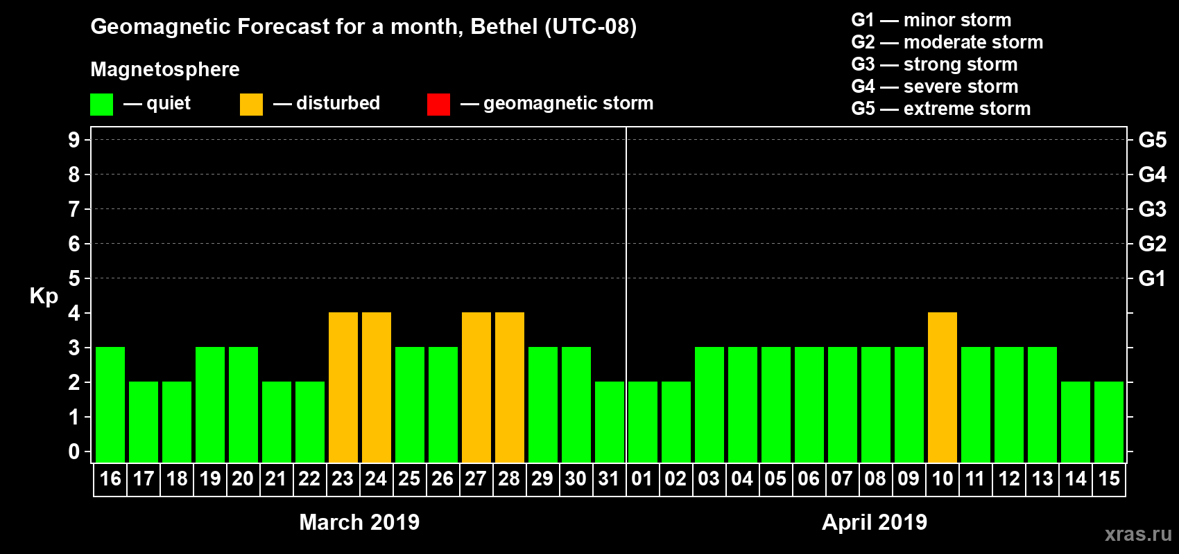 Geomagnetic storm forecast in Bethel for Mar 16, 2019