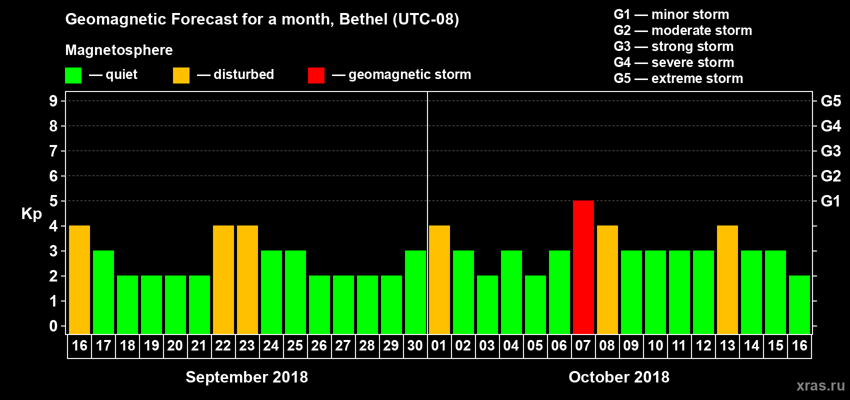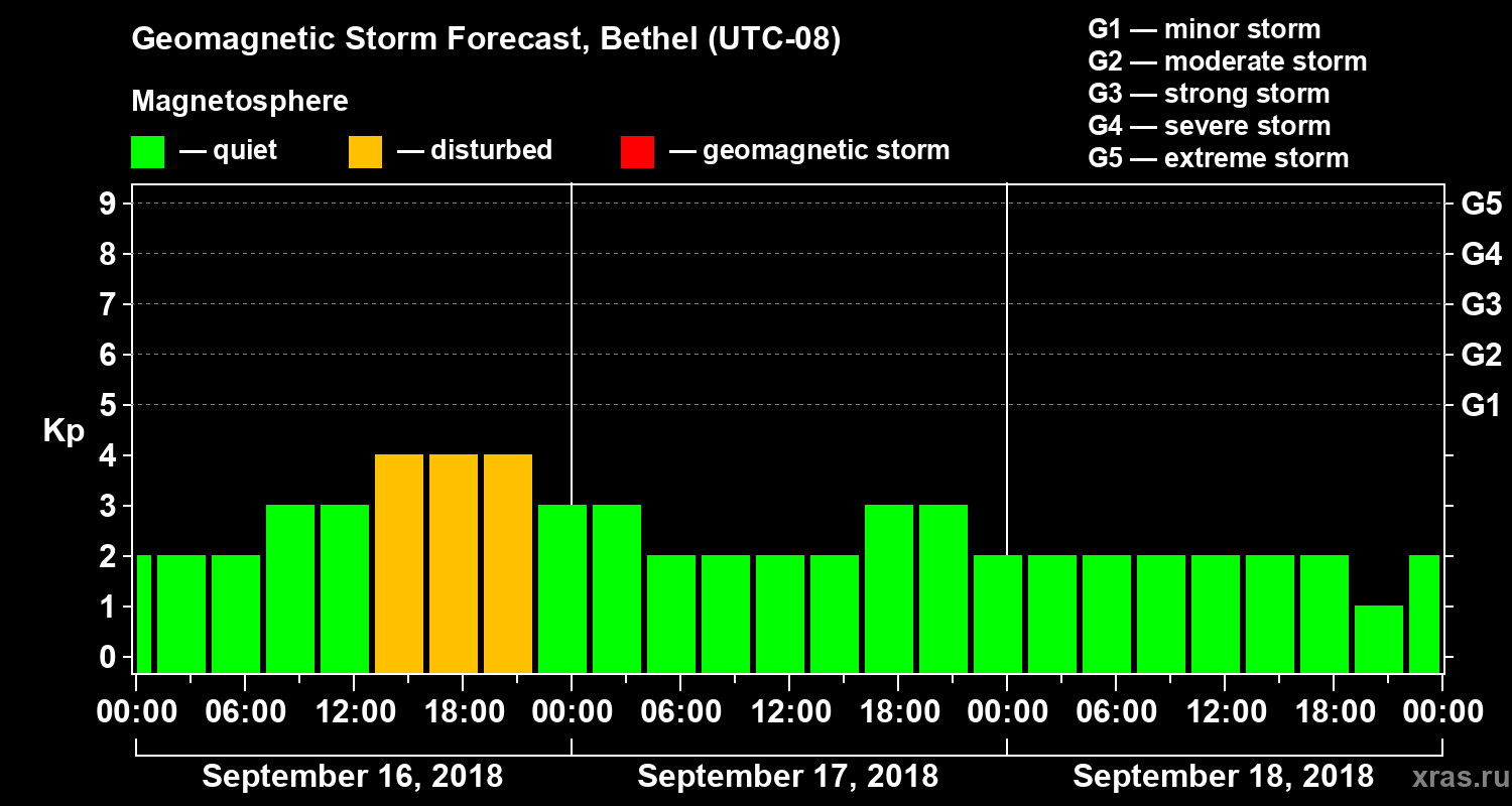 Geomagnetic storm forecast in Bethel for Sep 16, 2018