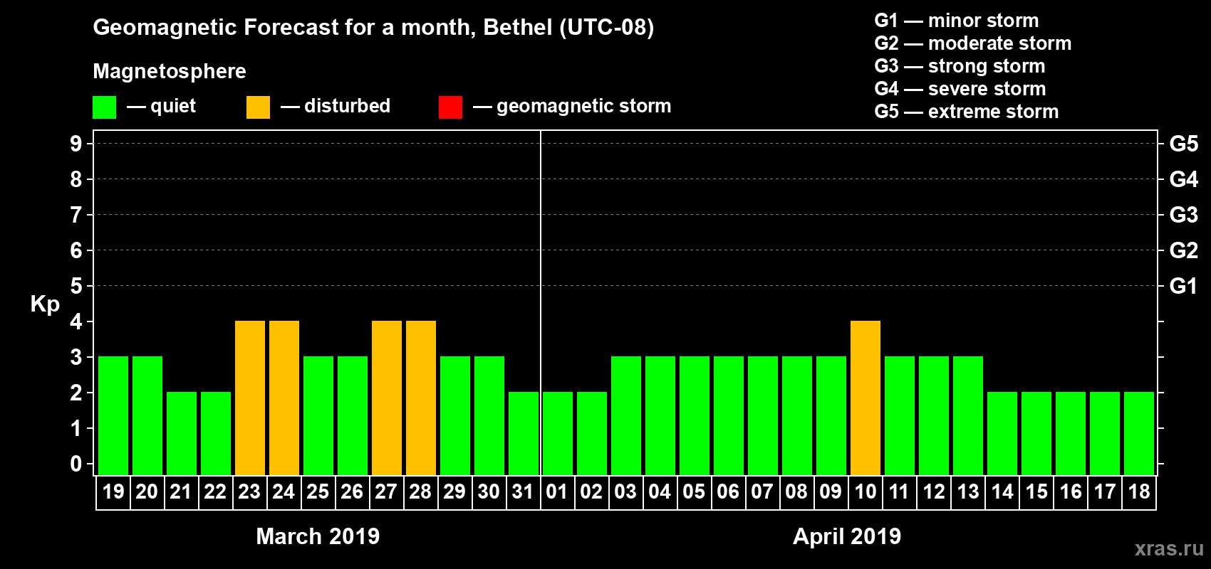 Geomagnetic storm forecast in Bethel for Mar 19, 2019