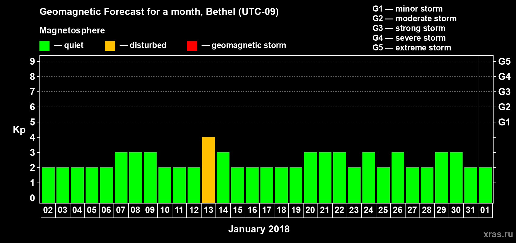 Geomagnetic storm forecast in Bethel for Jan 02, 2018