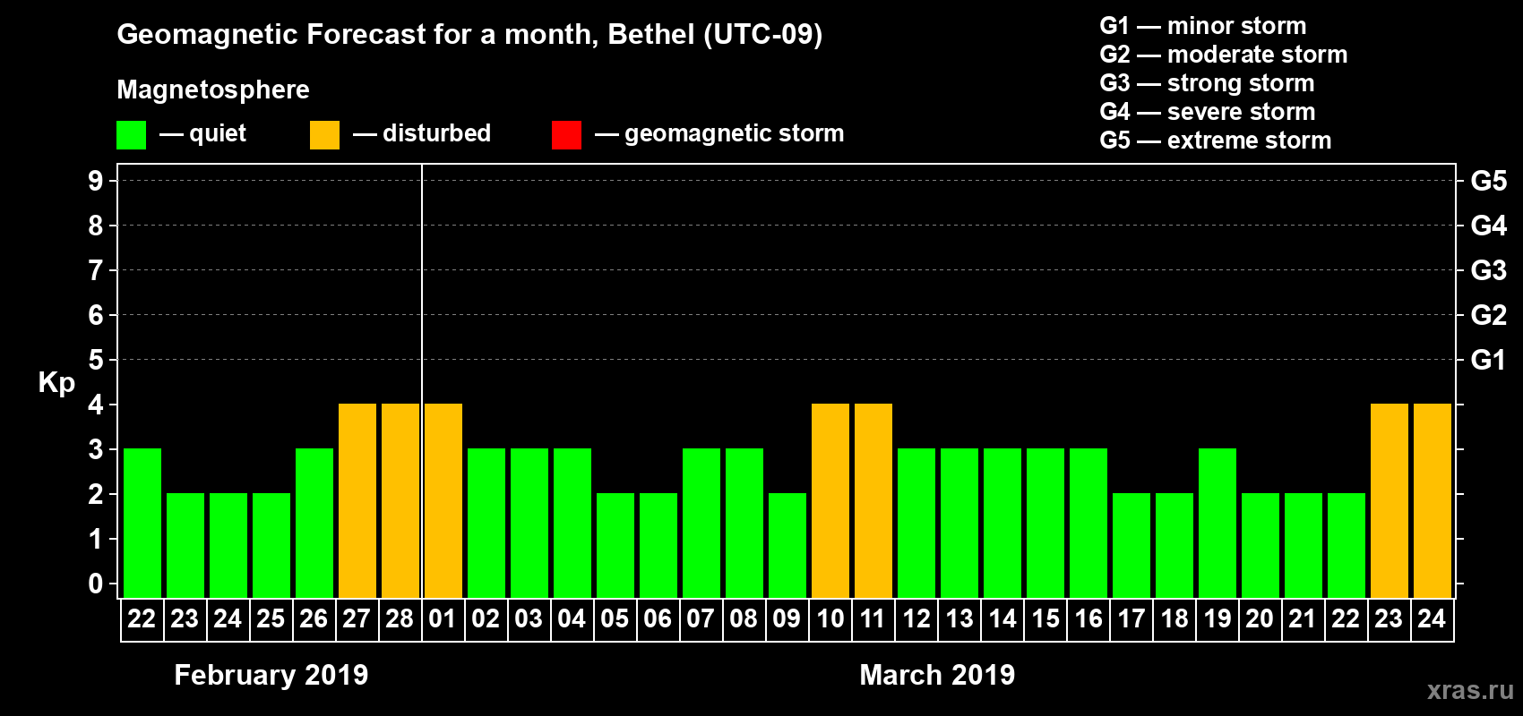 Geomagnetic storm forecast in Bethel for Feb 22, 2019