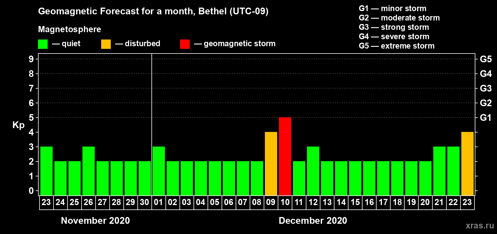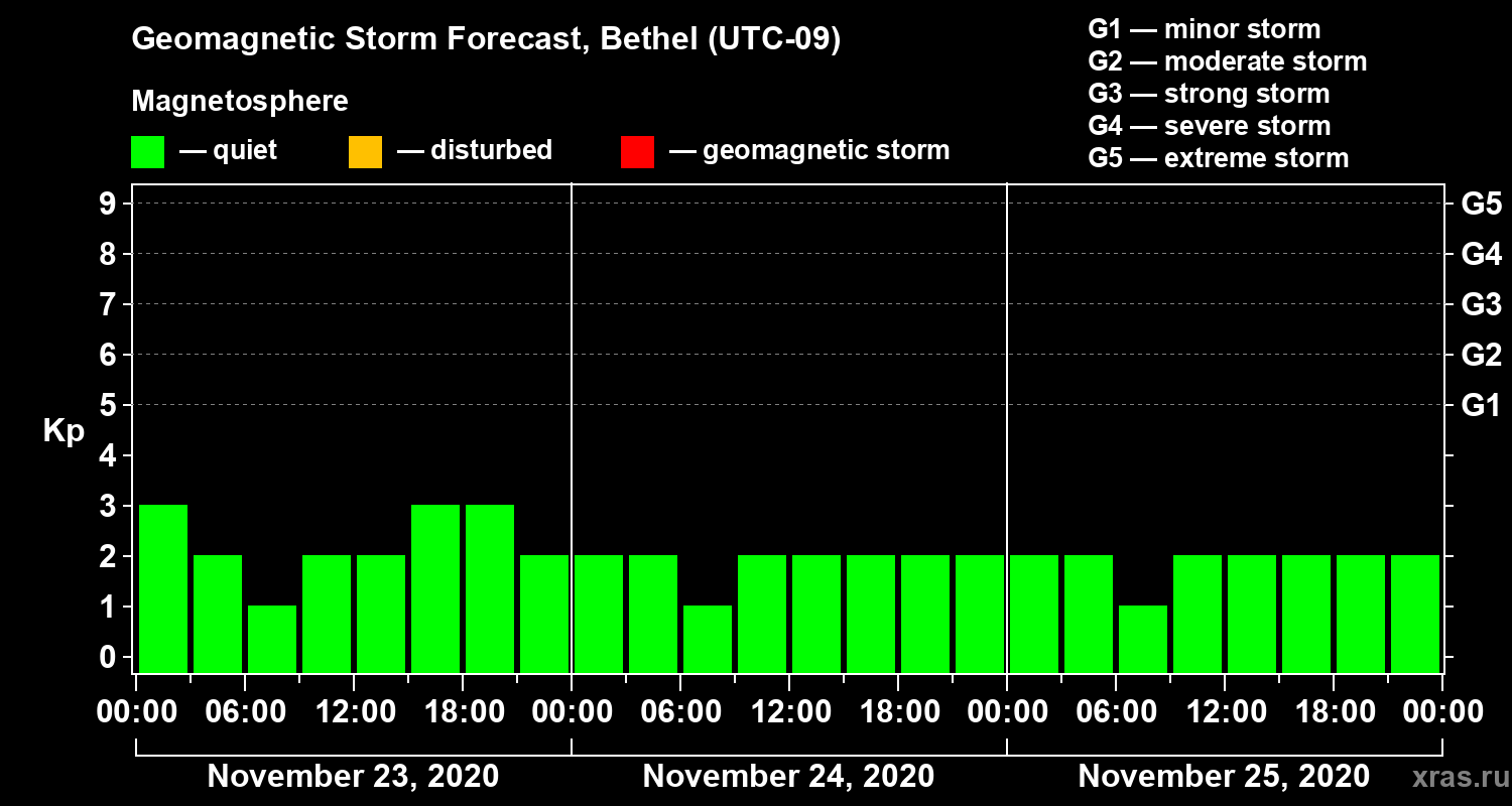 Geomagnetic storm forecast in Bethel for Nov 23, 2020