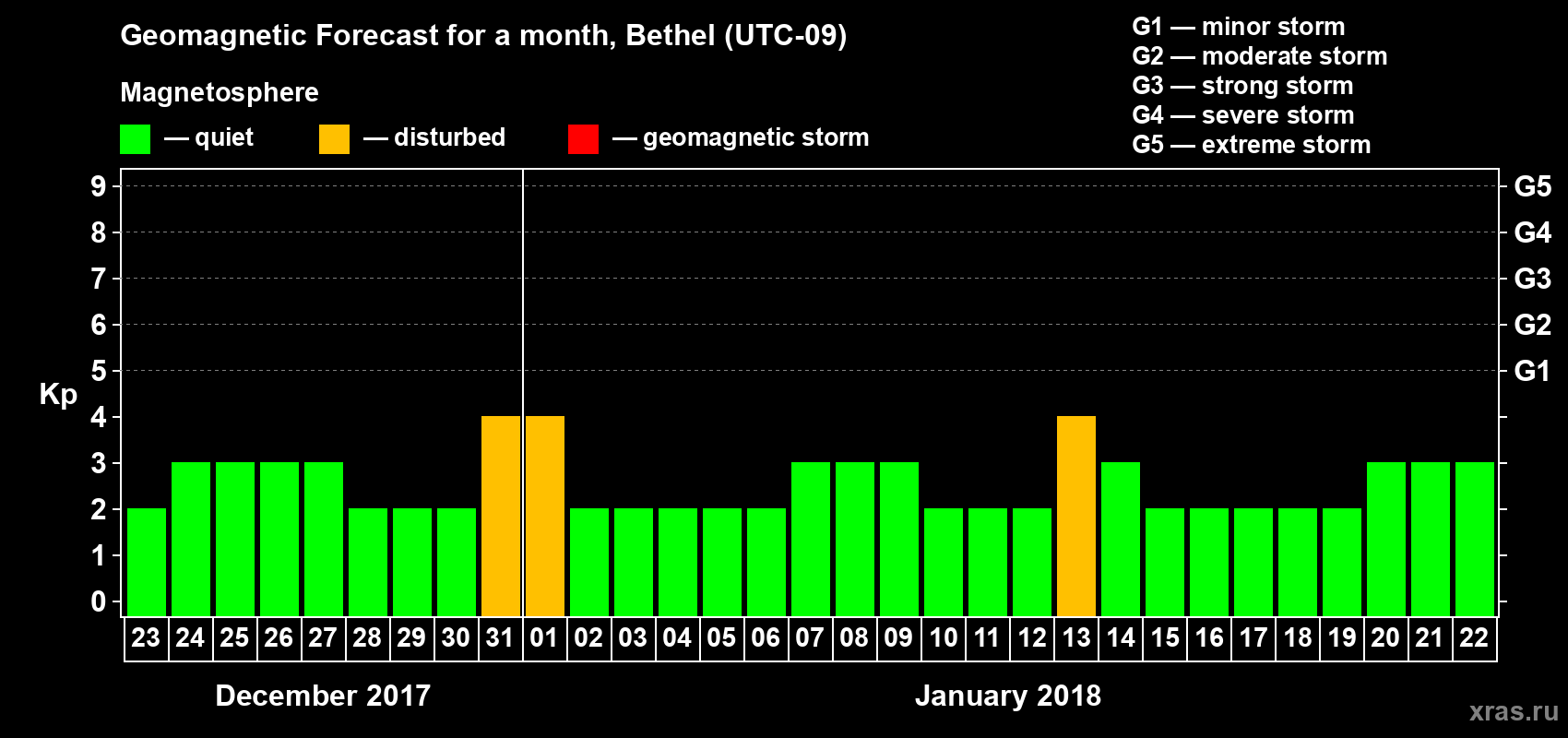 Geomagnetic storm forecast in Bethel for Dec 23, 2017