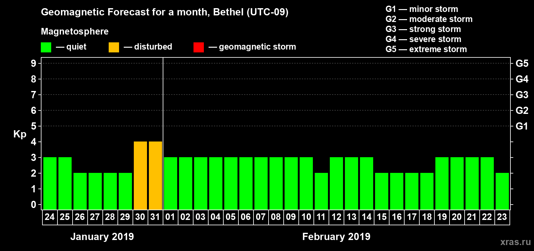 Geomagnetic storm forecast in Bethel for Jan 24, 2019