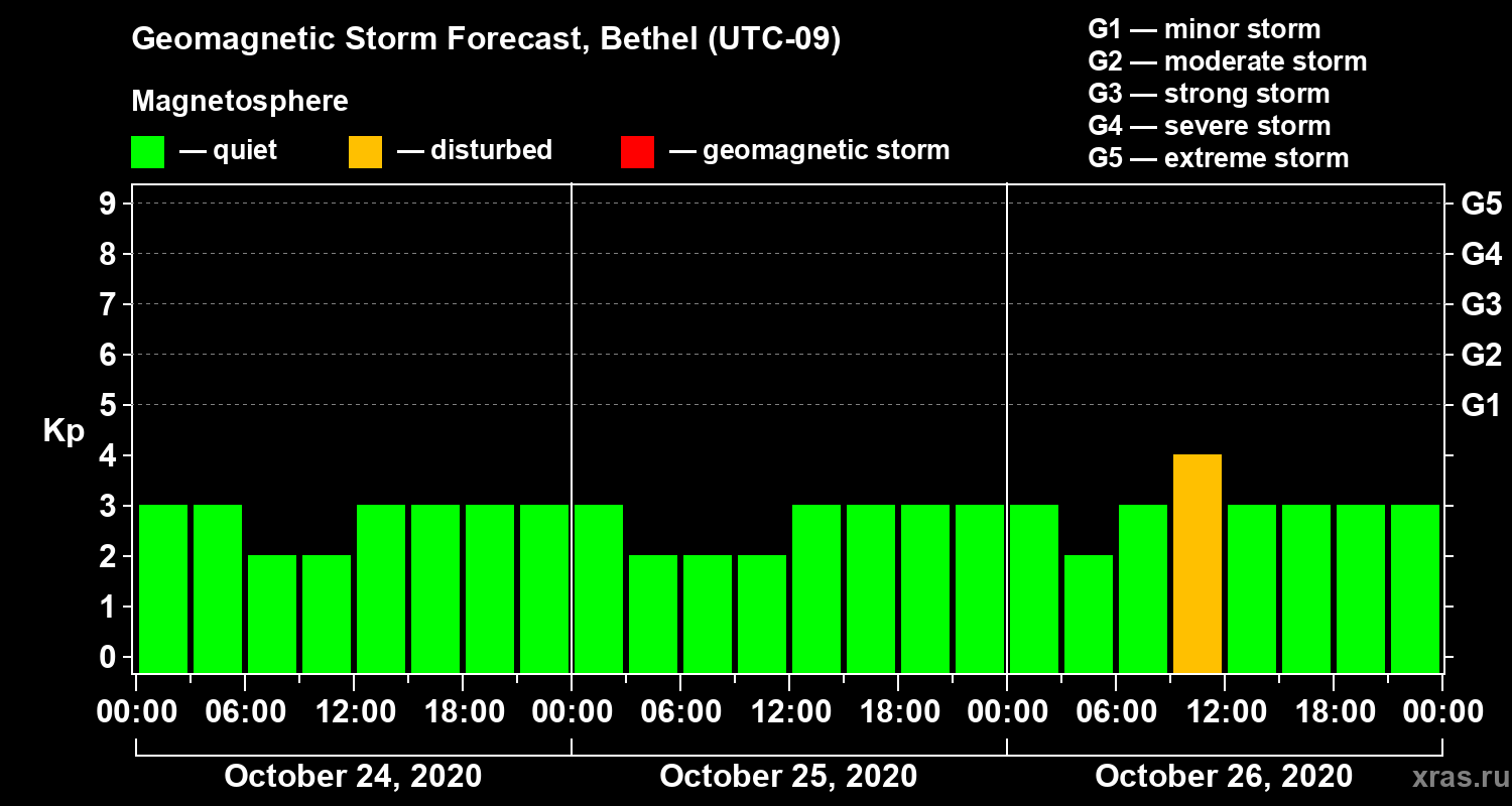 Geomagnetic storm forecast in Bethel for Oct 24, 2020